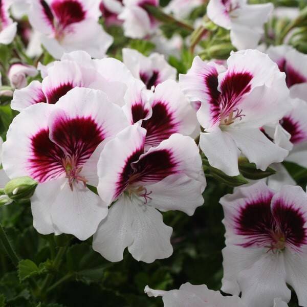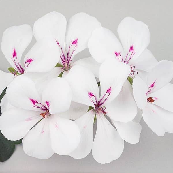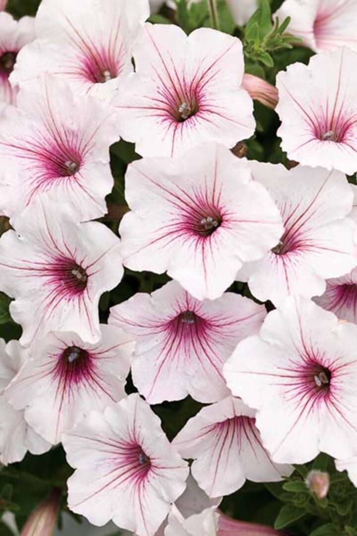 Deze hangende pelargoniums produceren, vanaf mei tot eind oktober, een echte waterval van witte bloemen met paarse aders om je manden, hanging baskets en bloembakken mee te vullen. Zeer betrouwbare en droogteresistente variëteit.