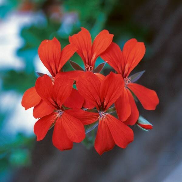 Deze hangende pelargoniums produceren, vanaf mei tot eind oktober, een echte waterval van scharlakenrode bloemen en klimopachtige bladeren. Zeer betrouwbare en droogteresistente variëteit. Uitermate geschikt voor bloembakken en hanging baskets.