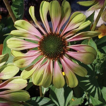 Een zeer mooie variëteit van Echinacea met tweekleurige bloemen, in zachtroze en licht limoengroen. Deze selectie, zacht maar vol karakter, vormt een groot boeket van grote pastelkleurige bloemen met een platte bruinoranje kegel, gedurende bijna 3 maanden in de zomer. Hij bloeit vanaf het eerste jaar. De plant, met robuuste stengels, behoudt een nette rechtopstaande uitstraling in borders en levert goede bloemen voor verse of gedroogde boeketten. Deze hoge vaste plant is robuust en gemakkelijk te kweken in de zon, in gewone tuingrond die in de zomer niet te droog is. De bloemen worden veel bezocht door vlinders, bijen en andere bestuivers.