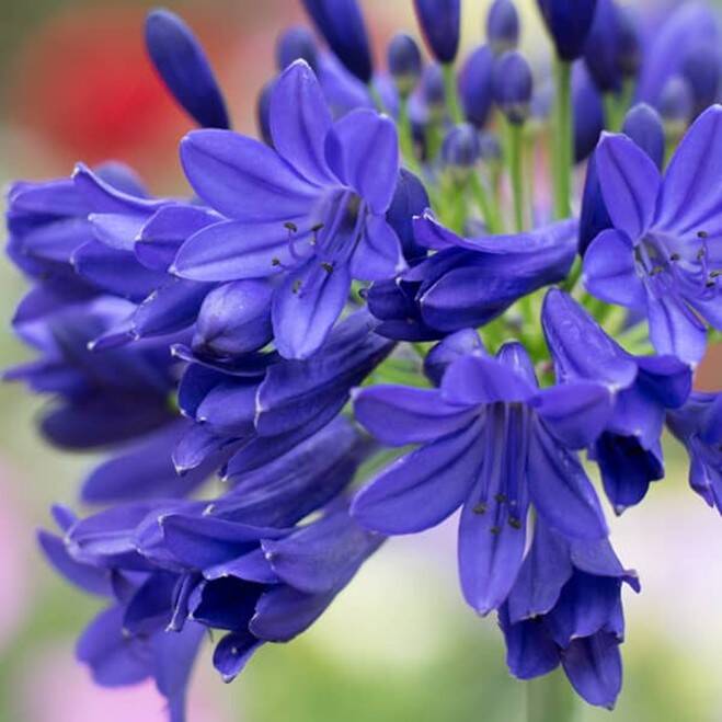 Deze compacte , violetblauwe Agapanthus met rijkelijke bloeiwijze aan stevige bloemstelen is bladhoudend en kenmerkt zich door een donkerblauwe streep in de bloem. Dit is een doorbloeier en kan tot 3 keer opnieuw bloeien. Kan reeds staan bloeien van april en bloeit door tot in november.
